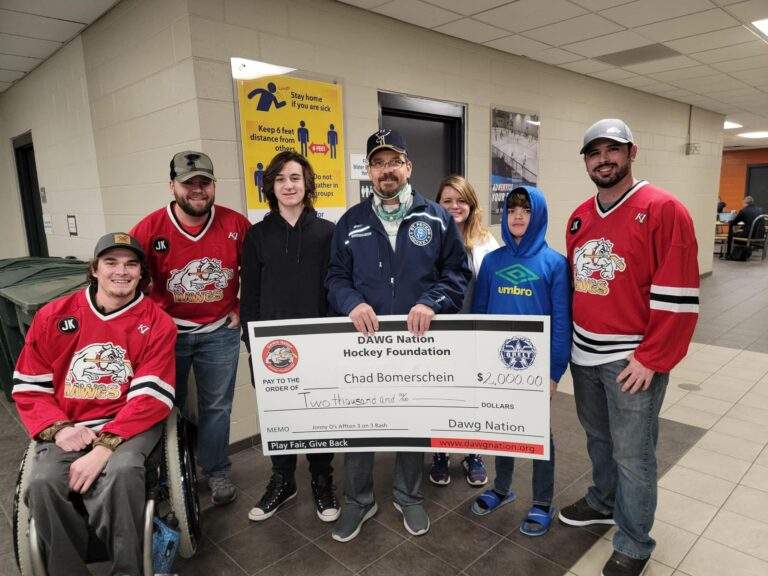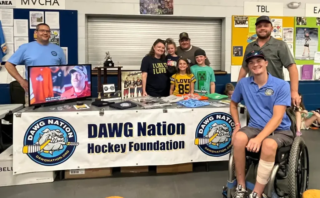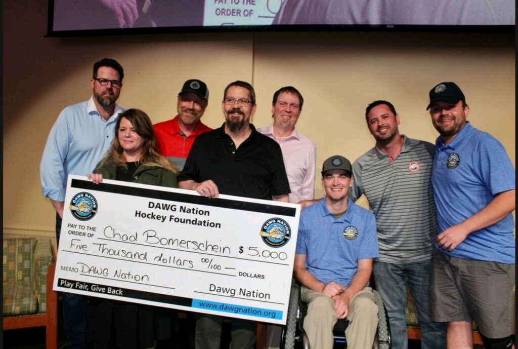 Chad has been making great strides in his recovery, even getting back to attending his boys’ hockey practices and games. His dream is to play hockey again, and he’s confident it will happen. In 2022, DAWG Nation showed their support for the Bomerscheins with a $2,000 check to help cover the annual deductible, but there’s still a long journey ahead. By 2025, Chad has become a proud supporter of the foundation, volunteering regularly whenever he can.