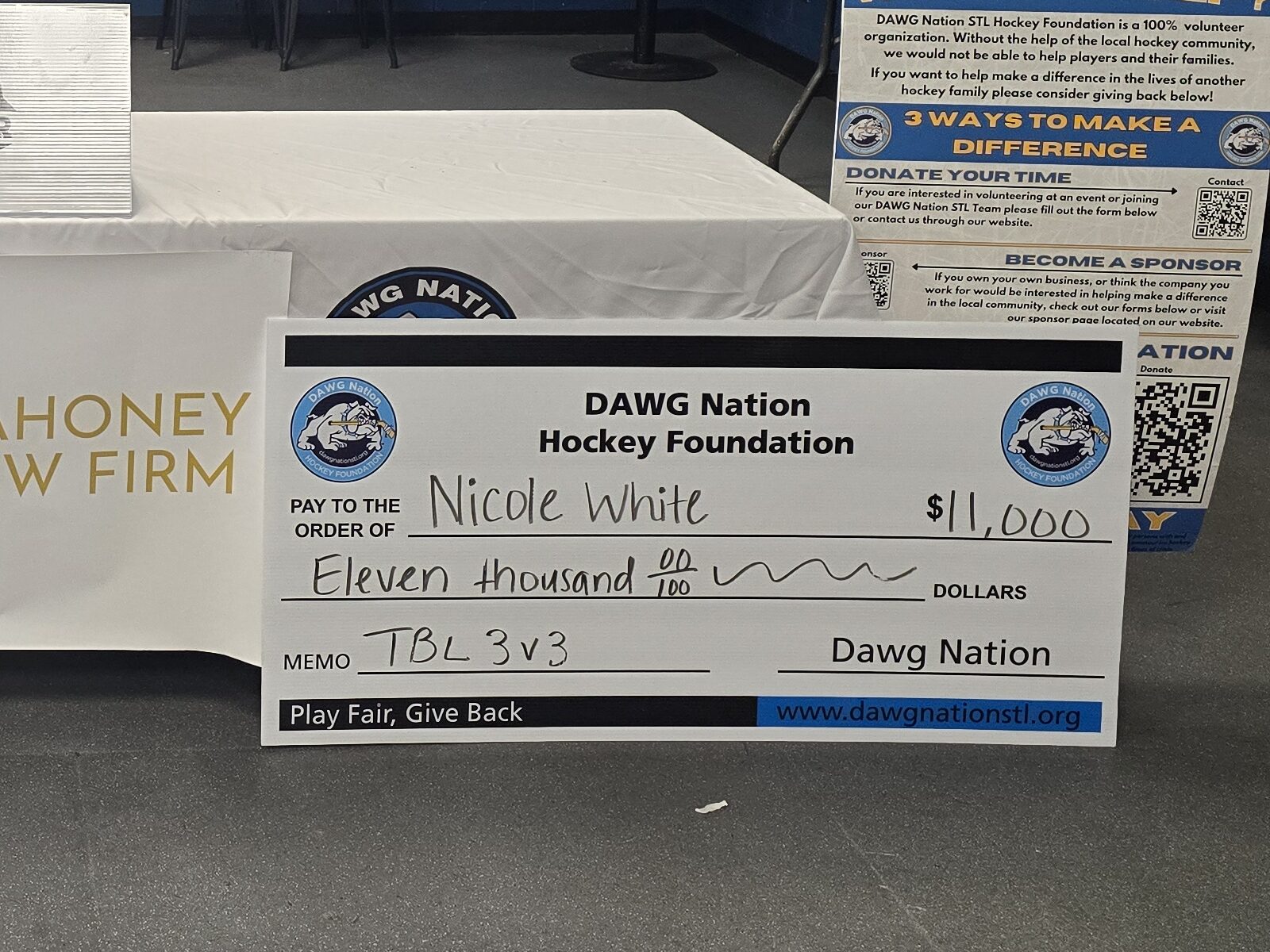 With TBL by our side, we came together for the annual TBL and DAWG Nation 3v3 Youth Hockey Tournament. Over the weekend, the hockey community showed its strength and solidarity during this challenging time. We were honored to present the White family with a check for $11,000. Nicole’s husband, Justin, has become part of our pack and regularly joins our Hockey Heals program.