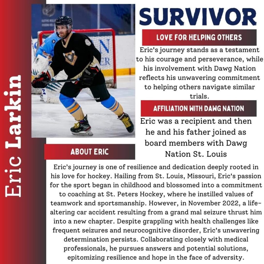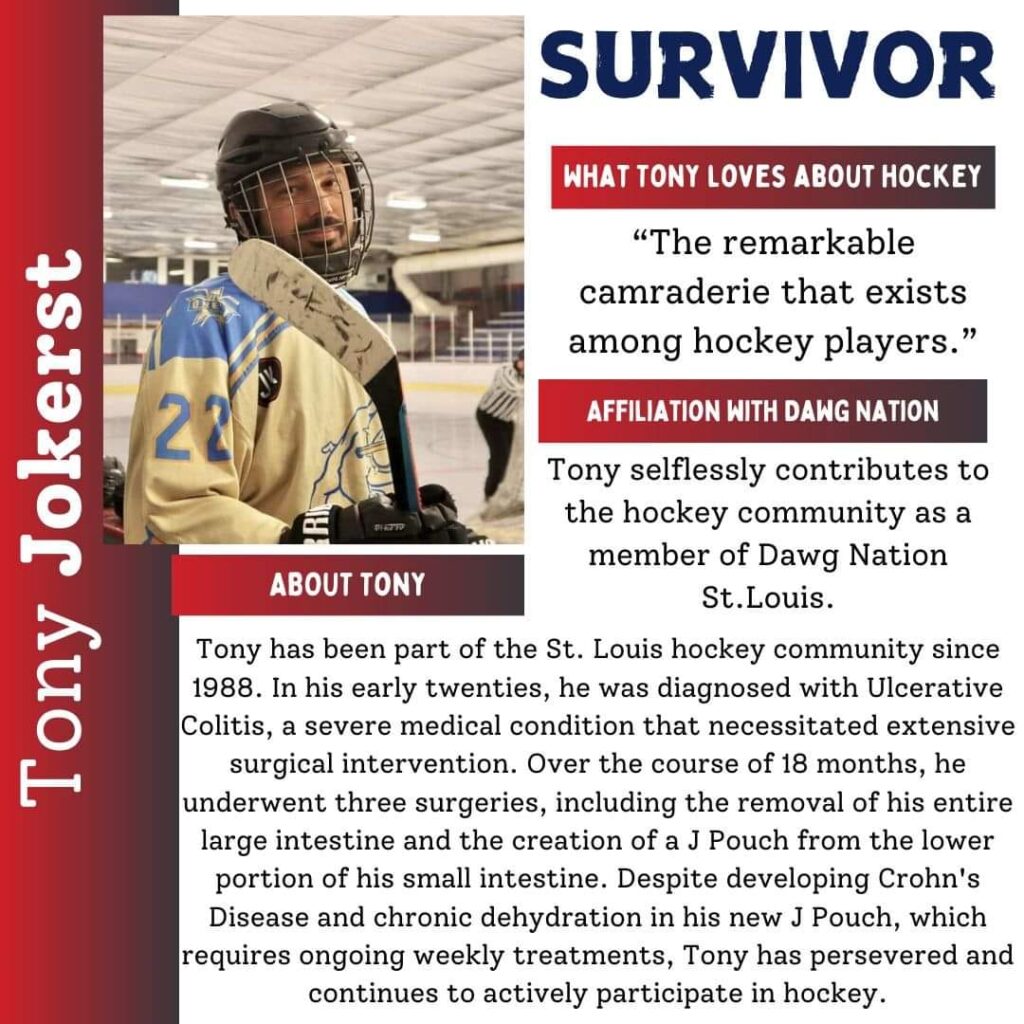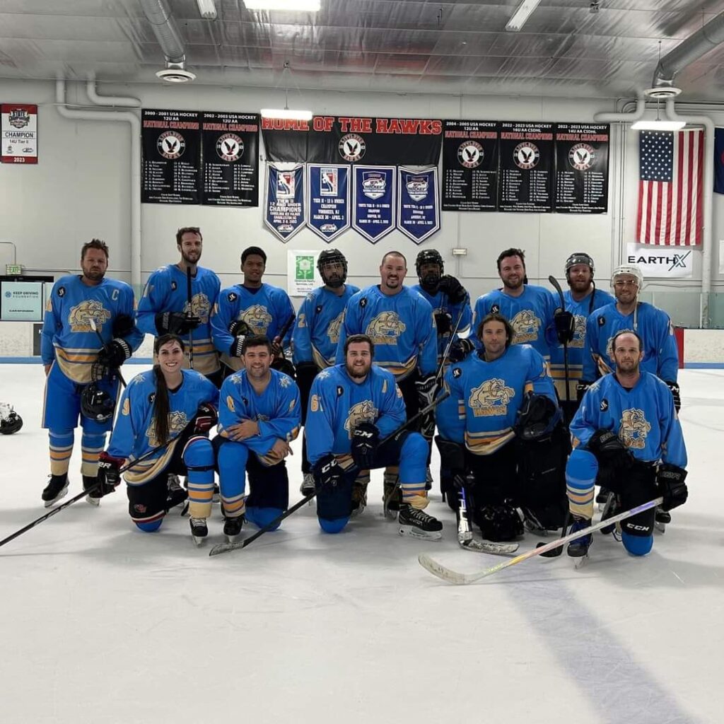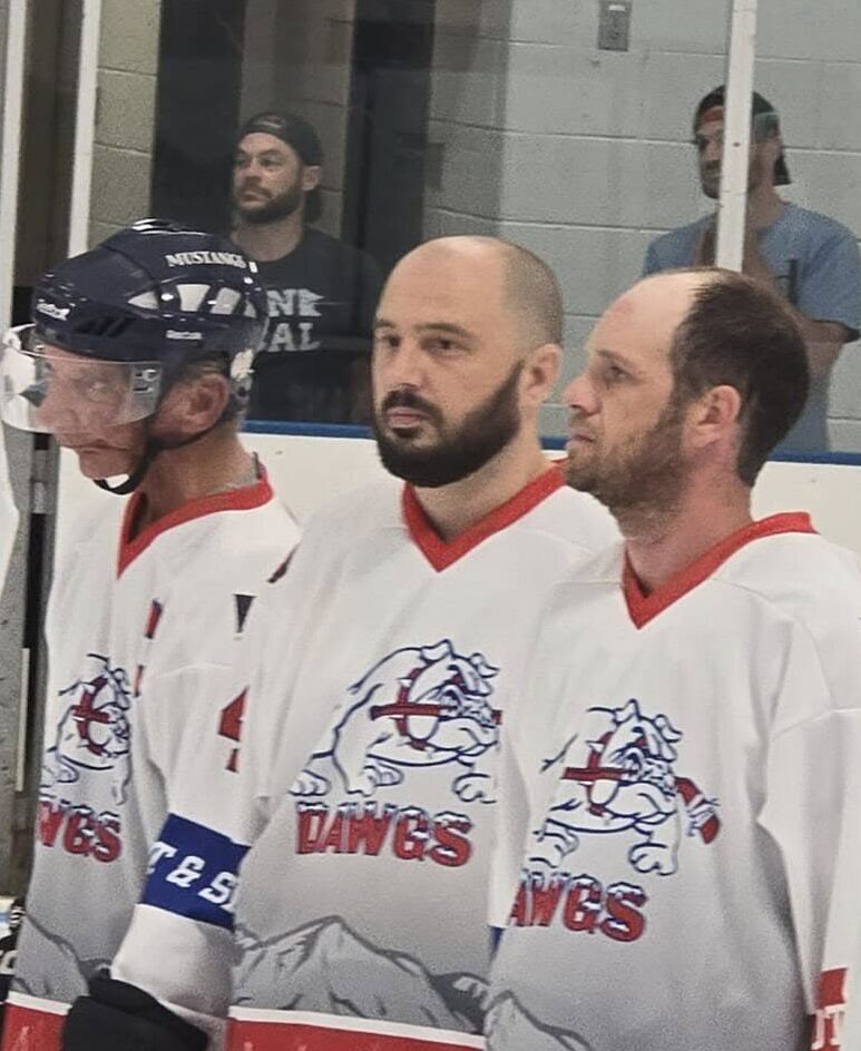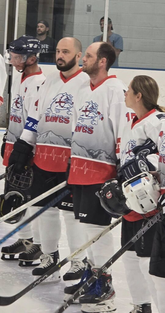 Recently, a few members of our Midwest DAWGS team had the privilege of joining DAWG Bowl 14 in Colorado, an incredible hockey tournament fundraiser featuring players of all abilities, from NHLers to beer leaguers and beyond! Eric Larkin and Tony Jokerst took part in the “Survivor Game,” which brought together individuals who have faced major life challenges with courage and strength. In November 2022, Eric suffered a grand mal seizure while driving, leading to a rollover accident with his family. While he’s made an amazing recovery, he still experiences seizures and is preparing for an important brain surgery in the coming weeks. During his time in Colorado, Eric’s resilience and determination left a lasting impact on new friends and our St. Louis crew. His spirit earned him and his father, Ed, spots as board members of our organization. We’re sending all our support and positive vibes to Eric as he faces this next step, confident he’ll tackle it with the same grit he’s always shown. We also finally met Adam Dowling, who has been bravely fighting a brain tumor while dealing with the tough effects of chemo and radiation. Originally from St. Louis and now living in Colorado Springs, Adam made the trip to Littleton so we could meet in person. We were honored to share the love and support he received during the Jonny O’s DAWG Nation Winter Classic last February at the Steinberg Skating Rink. Unfortunately, no photograph was taken.